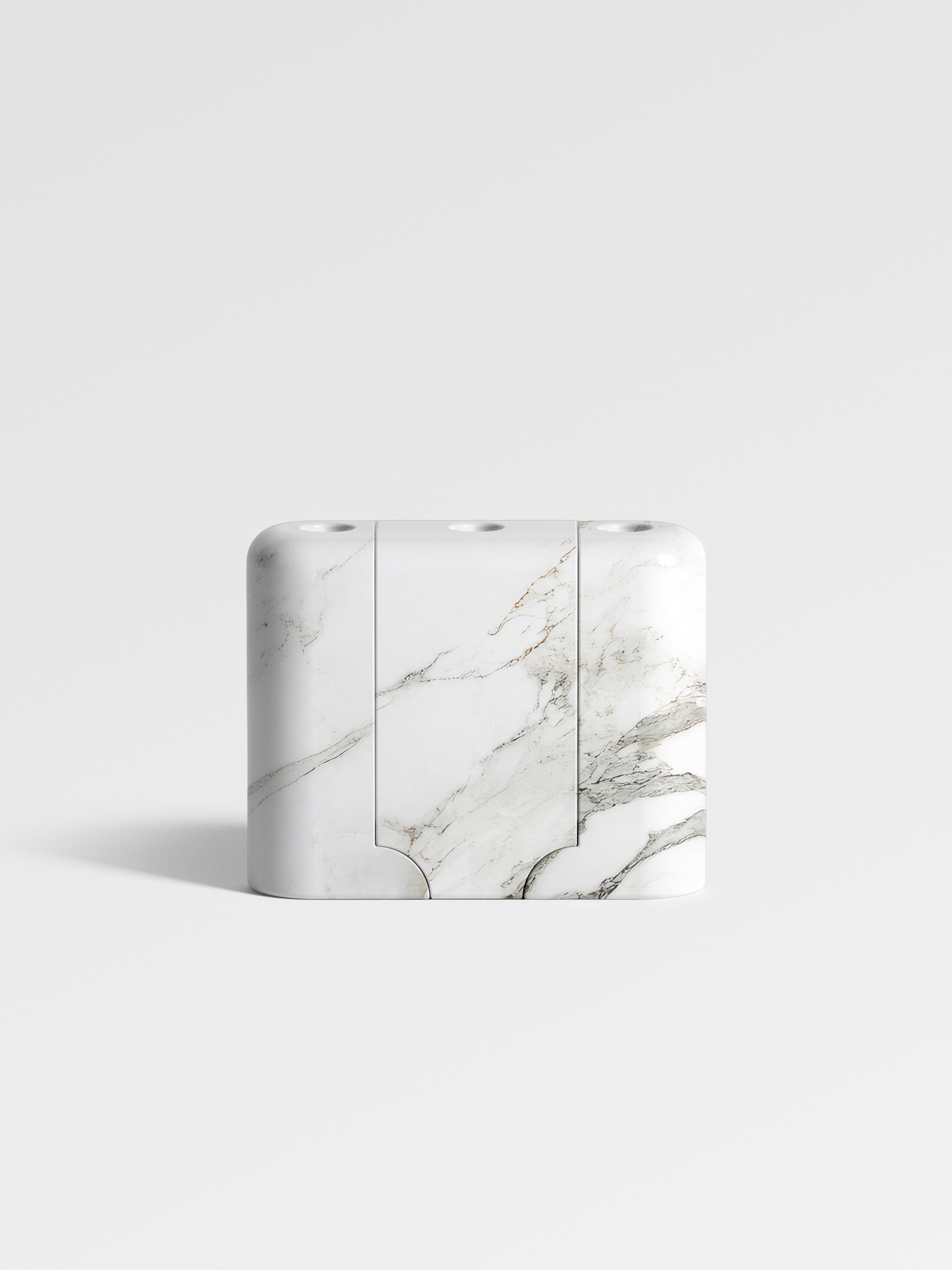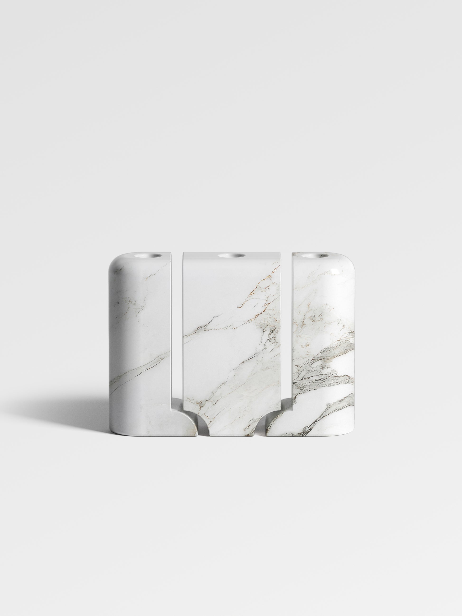 Set of three candle holders made in elegant Carrara Statuario marble. They can be used separately or assembled together like a puzzle to form a sculptural centerpiece for your décor. Handcrafted to order in Tuscany, Italy