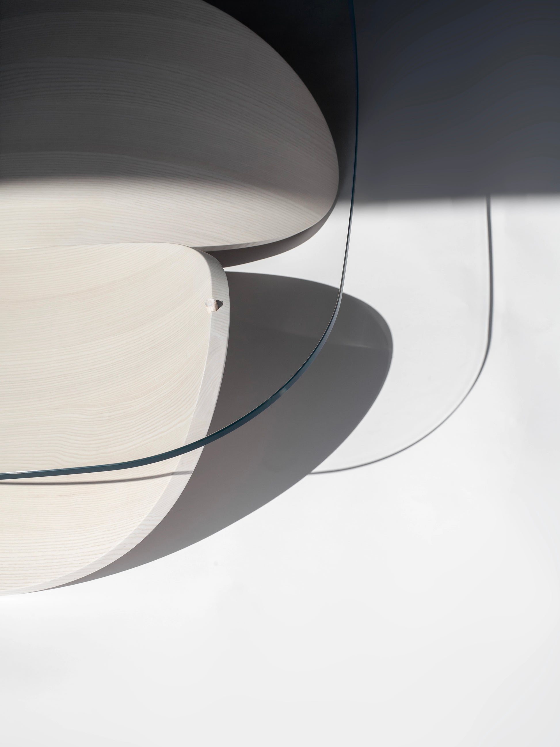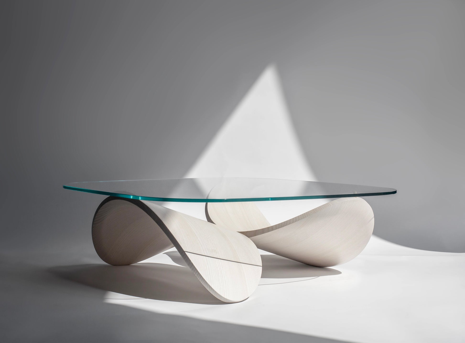 The base features two identical wooden shells that are crafted from steam-bent solid ash wood and finished by hand in a water-based off-white stain. The top is made in toughened glass with a refined shape that follows the playful forms of the base.