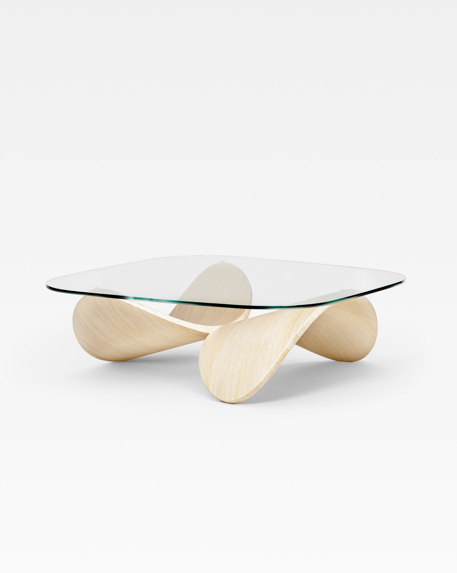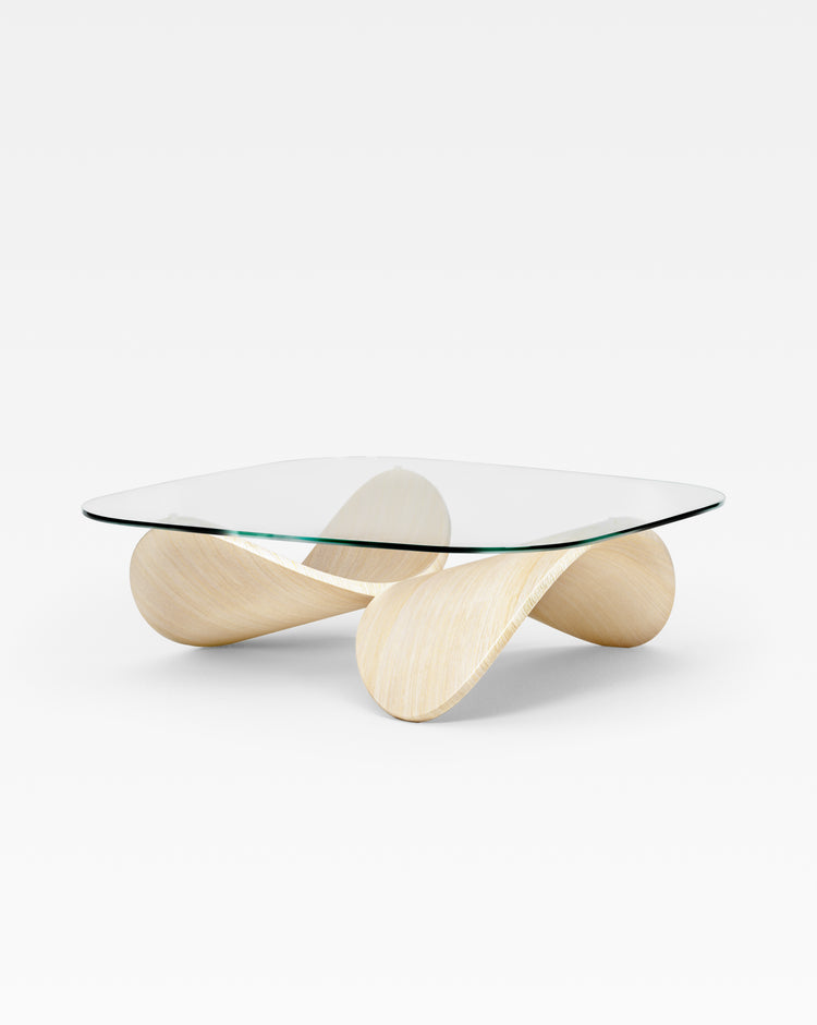 The base features two identical wooden shells that are crafted from steam-bent solid ash wood and finished by hand in a water-based transparent lacquer. The top is made in toughened glass with a refined shape that follows the playful forms of the base.