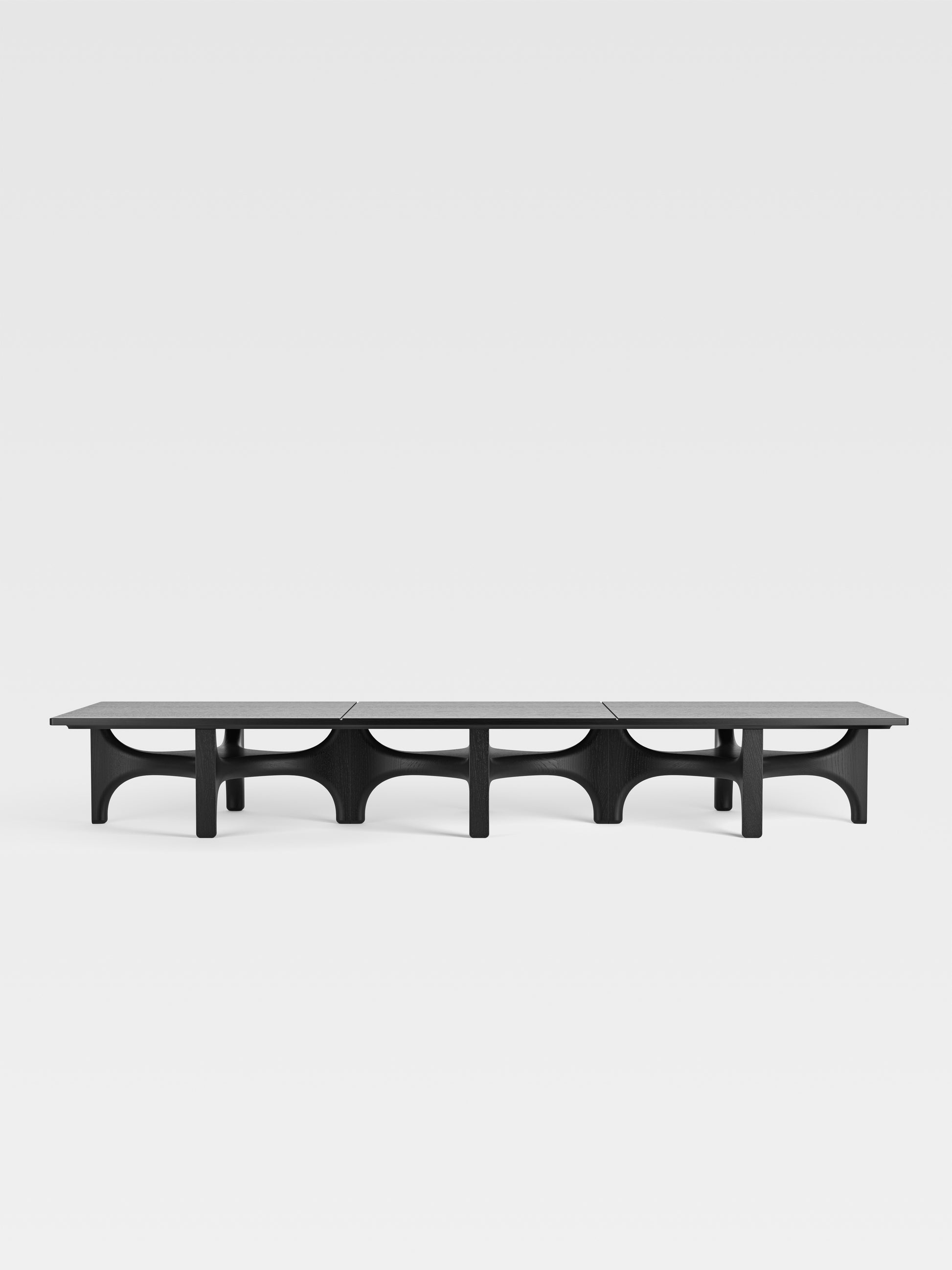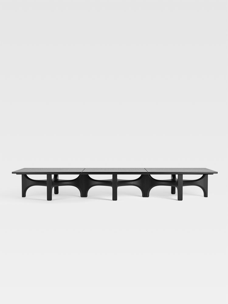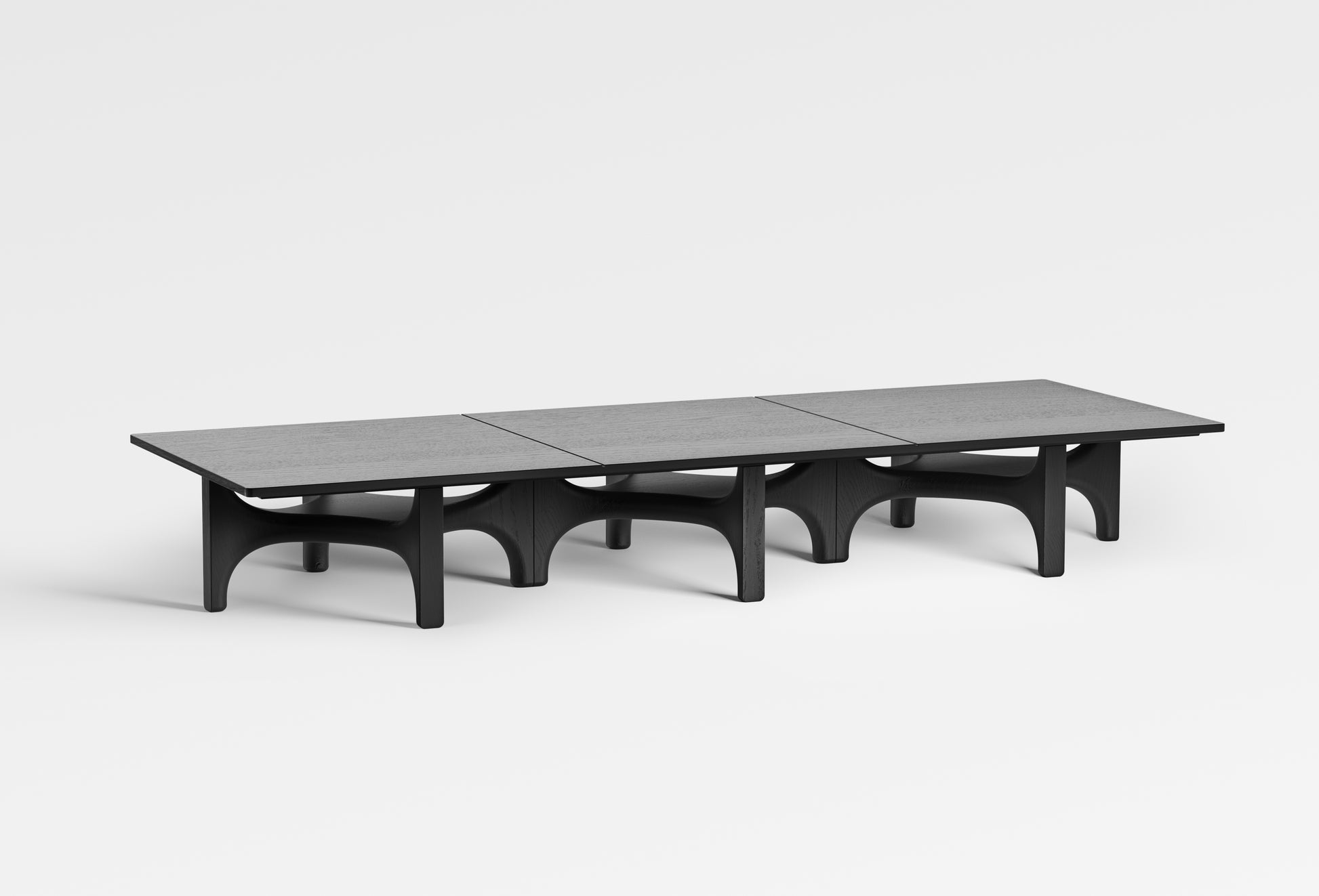 Shown here is a long rectangular version made with three base modules. It has a black finish and uses a solid wood top with grooves that mark the positions of the modules beneath.