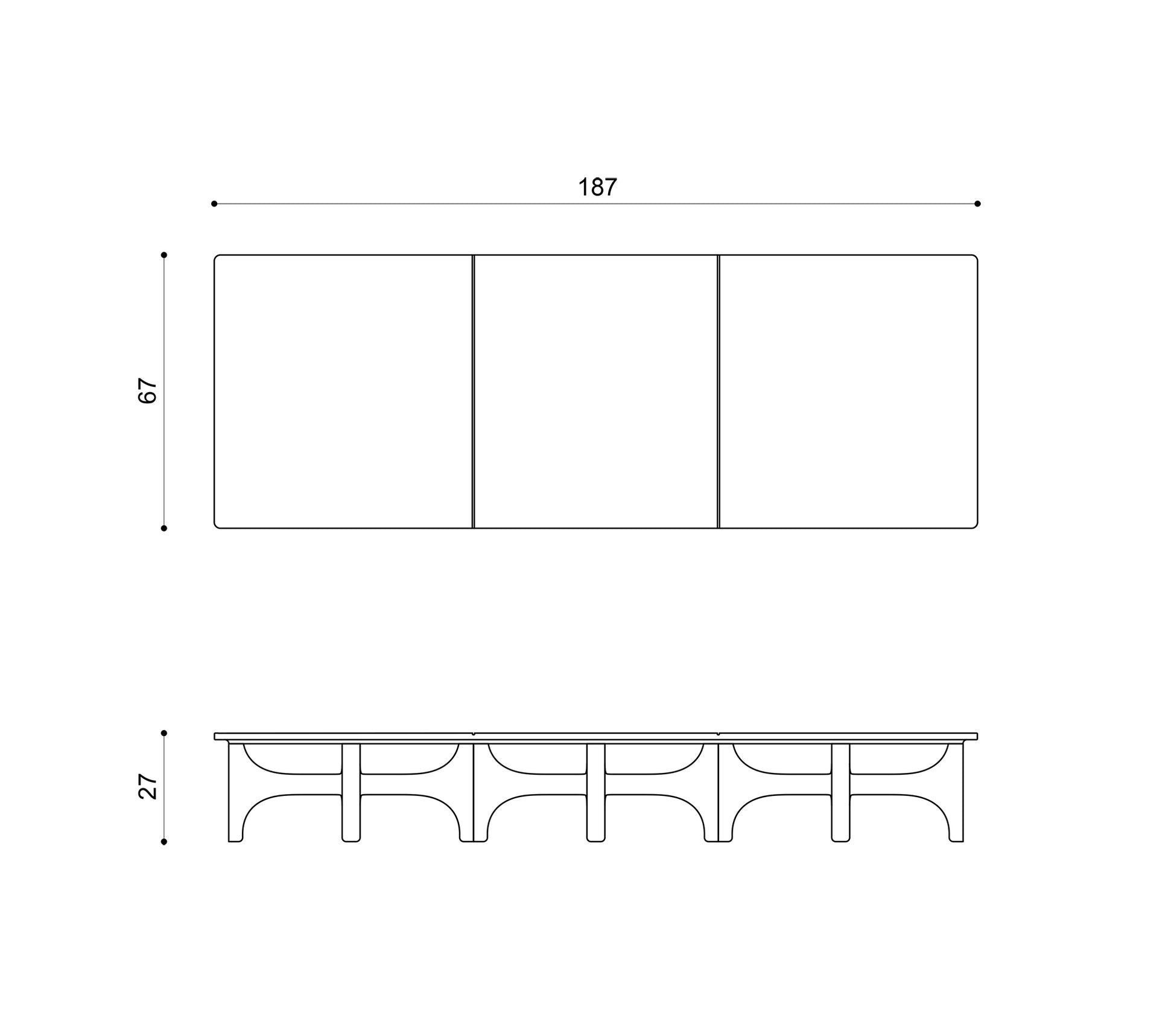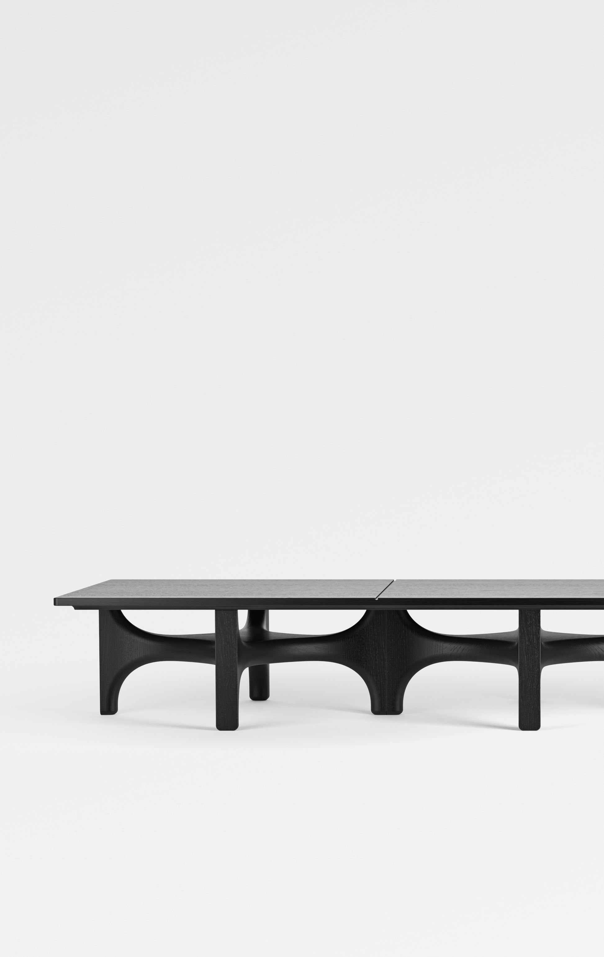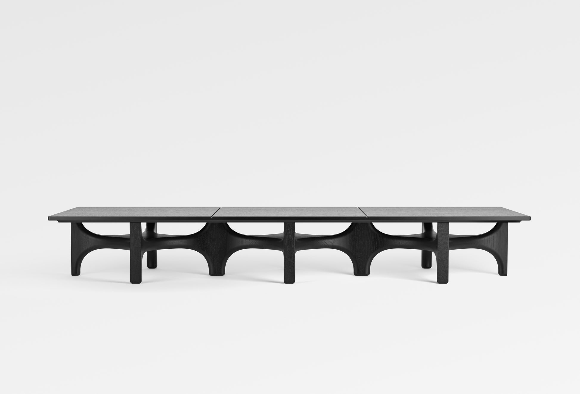 Shown here is a long rectangular version made with three base modules. It has a black finish and uses a solid wood top with grooves that mark the positions of the modules beneath.
